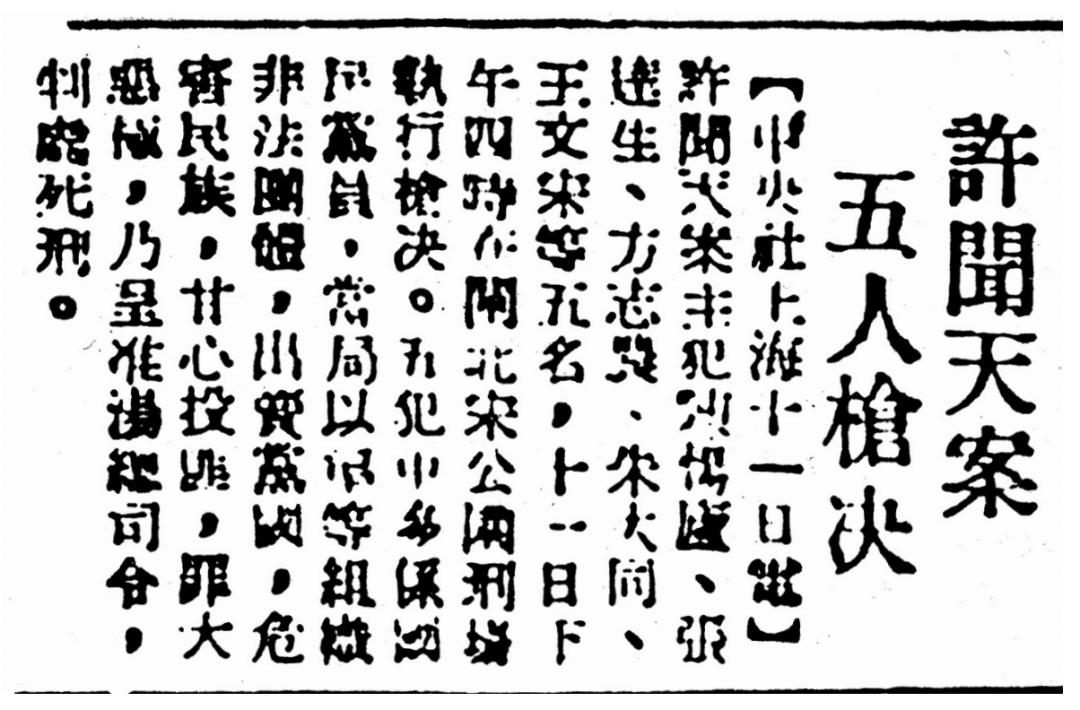 而被非法逮捕的陈惕庐、张达生、朱大同、方志农、王文中5人,则于1949年5月11日被枪杀于上海虹口公园。
