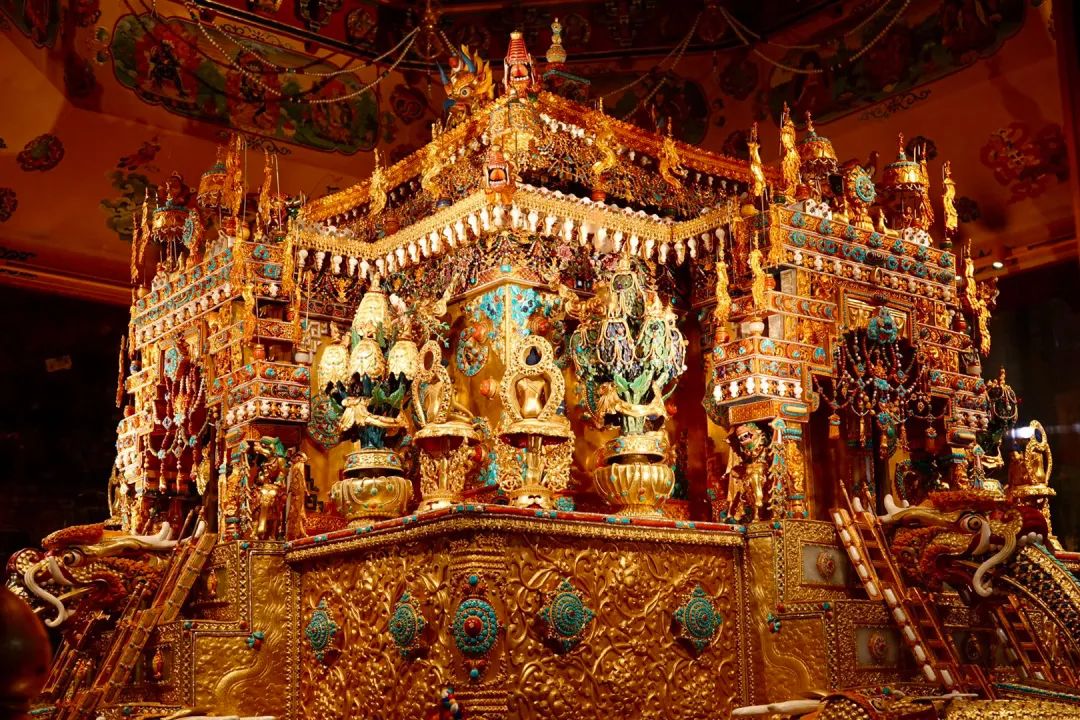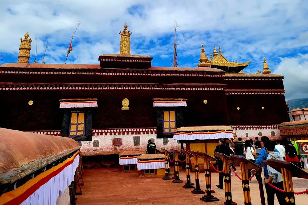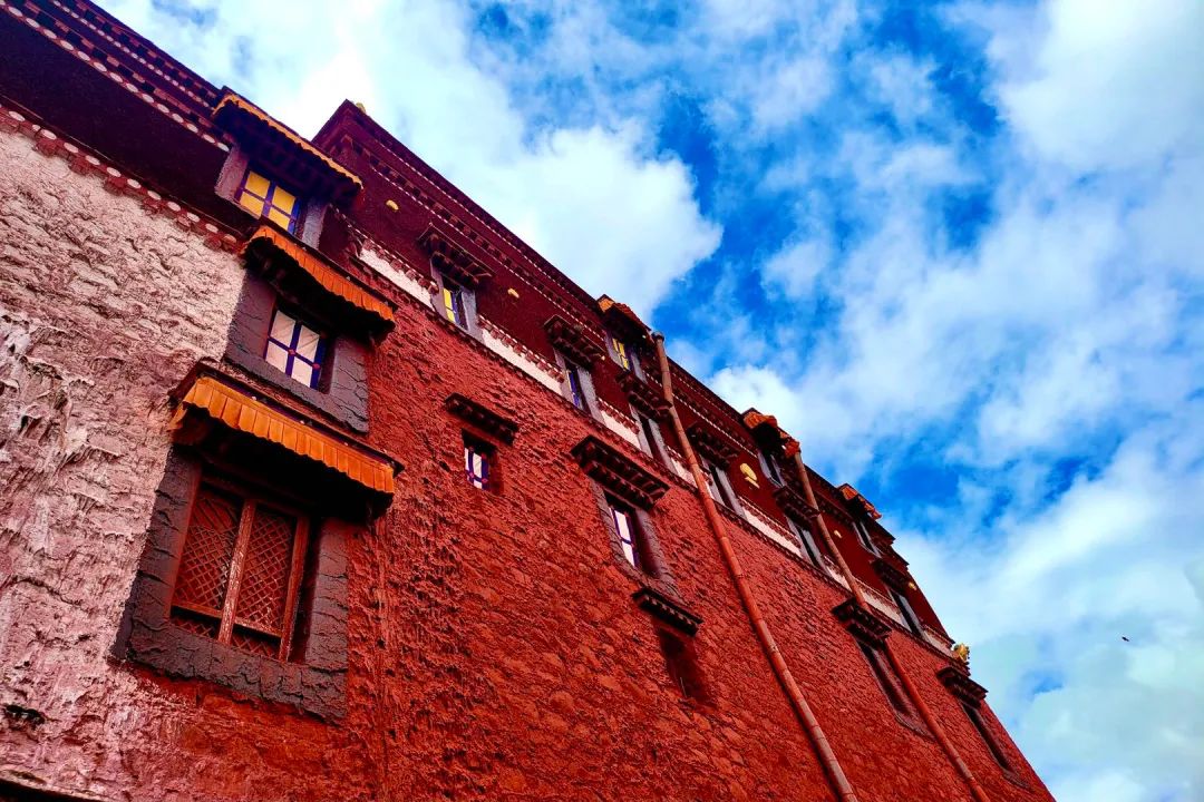 爬上数百级的台阶并不容易,高反带来的一些疲惫感立马爬上了脑门。跟着讲解,我走进这座雪域高原的宫殿。不是整座宫殿都对外开放的,并且宫内是不允许拍照的,虽有点可惜,但感官也被更积极的调动起来。穿行其间,闻着弥漫在楼宇廊阁中的藏香,看着酥油灯火苗映照下的精美壁画、佛像,镶嵌各种珠宝玉石的灵塔和一摞摞经卷,瞬时让人体会到这里的厚重以及这座宫殿所指代的精神高度。