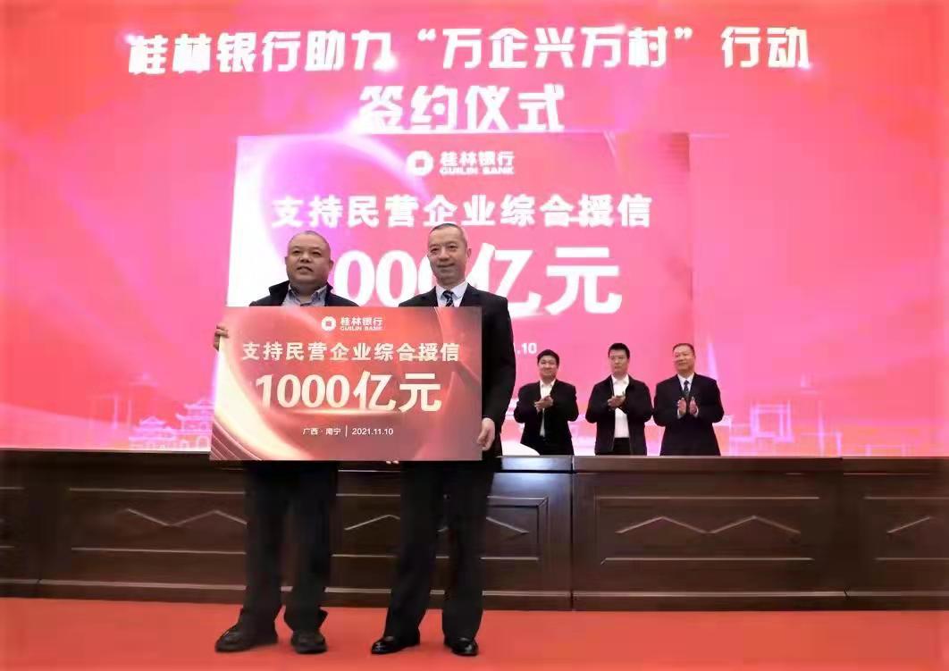 会上,自治区工商联和桂林银行签署了战略合作框架协议,桂林银行现场与15家企业签署授信协议,签约金额70.79亿元,并承诺未来5年对全区民营企业提供1000亿元意向授信金额,支持广西民营企业助力乡村振兴;还举办了广西工商联第二十二期商会讲坛,桂林银行首席运营官王曙初主讲了《金融服务乡村振兴的桂林银行思考和探索》,并就桂林银行的金融政策和金融服务作了介绍。