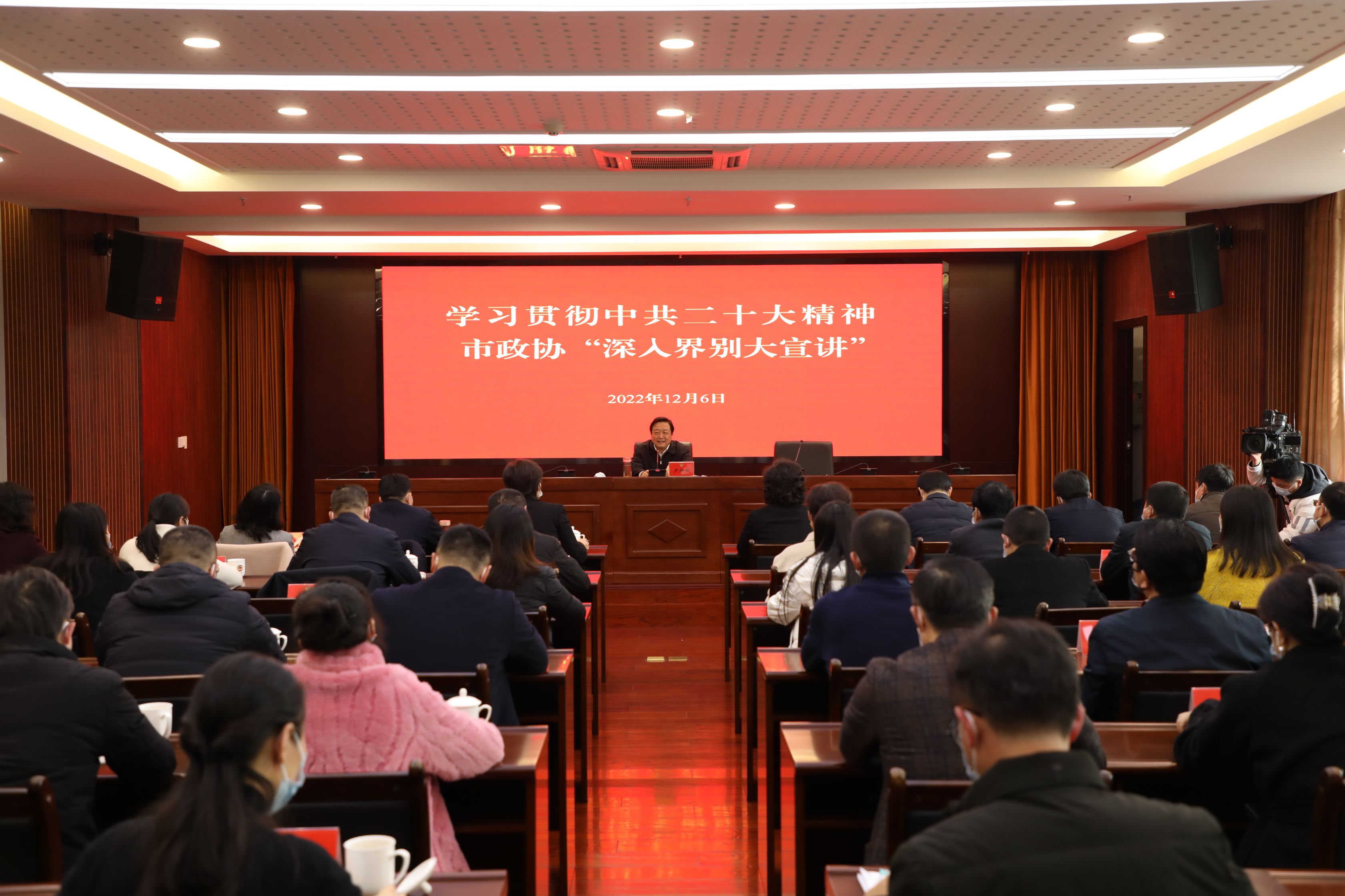 他指出,党的二十大宣示了我们党在新征程上举什么旗、走什么路、以什么样的精神状态、朝着什么样的目标继续前进,对于指引党和人民向第二个百年奋斗目标进军、奋力谱写新时代中国特色社会主义更加绚丽的华章具有重大而深远的意义。学习贯彻党的二十大精神,最重要最根本的就是要深刻领悟“两个确立”的决定性意义。“两个确立”是党在新时代最重大的政治成果,是新时代引领党和国家事业从胜利走向新的胜利的政治保证,是战胜一切艰难险阻、应对一切不确定性的最大确定性、最大底气、最大保证。我们要深刻领悟“两个确立”的决定性意义,坚定捍卫“两个确立”、坚决做到“两个维护”。全市各级政协组织和广大政协委员要坚持读原著、学原文、悟原理,学思用贯通、知信行统一,把党的二十大精神转化为指导实践、推动工作的强大力量。要持续开展“深入界别大宣讲”活动,政协党组成员深入所联系界别、党员召集人深入界别联系点、党员委员深入界别群众,分众化宣讲党的二十大精神,助力二十大精神落地生根、开花结果。