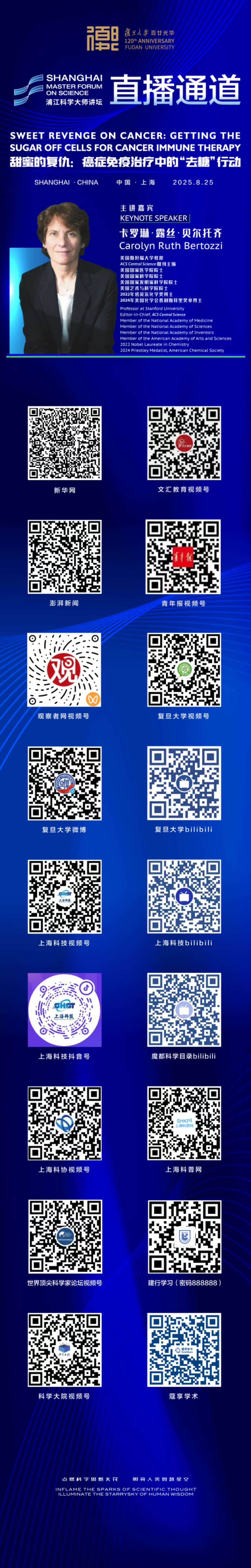 主讲嘉宾:卡罗琳·露丝·贝尔托齐(美国斯坦福大学教授、ACS Central Science 期刊主编、美国国家医学院院士、美国国家科学院院士、美国国家发明家科学院院士、美国艺术与科学院院士、2022 年诺贝尔化学奖得主、2024 年美国化学会普利斯特里奖章得主)