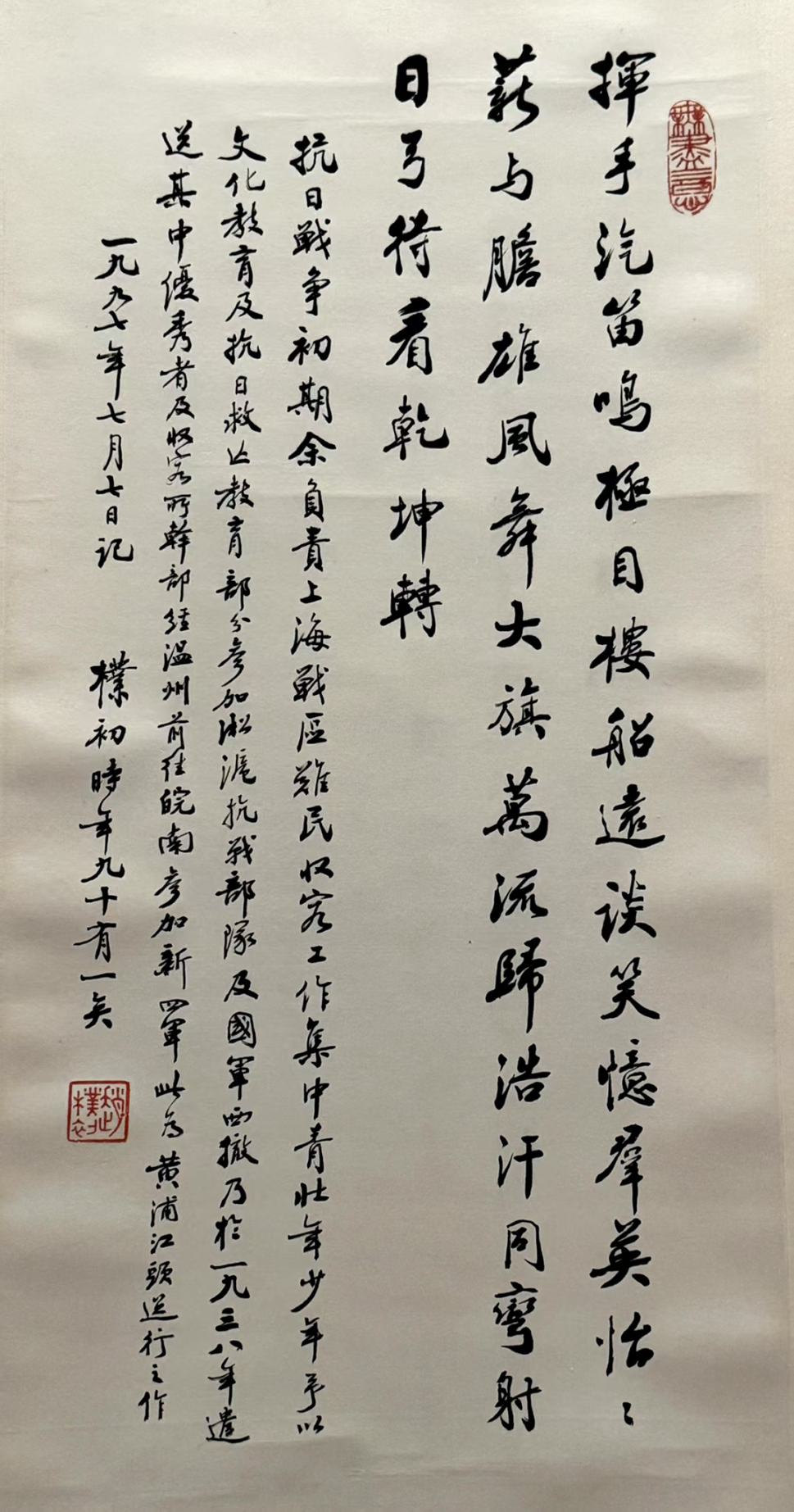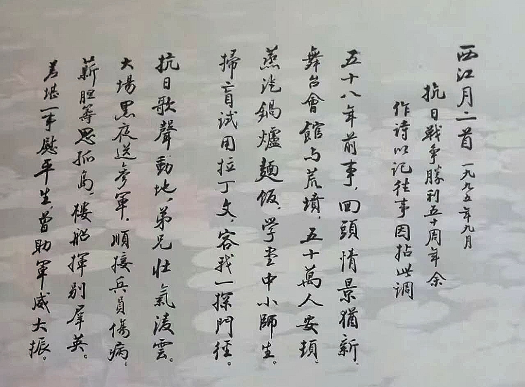 1995年9月,伯父朴老写下《西江月》两首,纪念抗日战争胜利五十周年。深切回顾当年安顿难民、教养难童的件件往事。