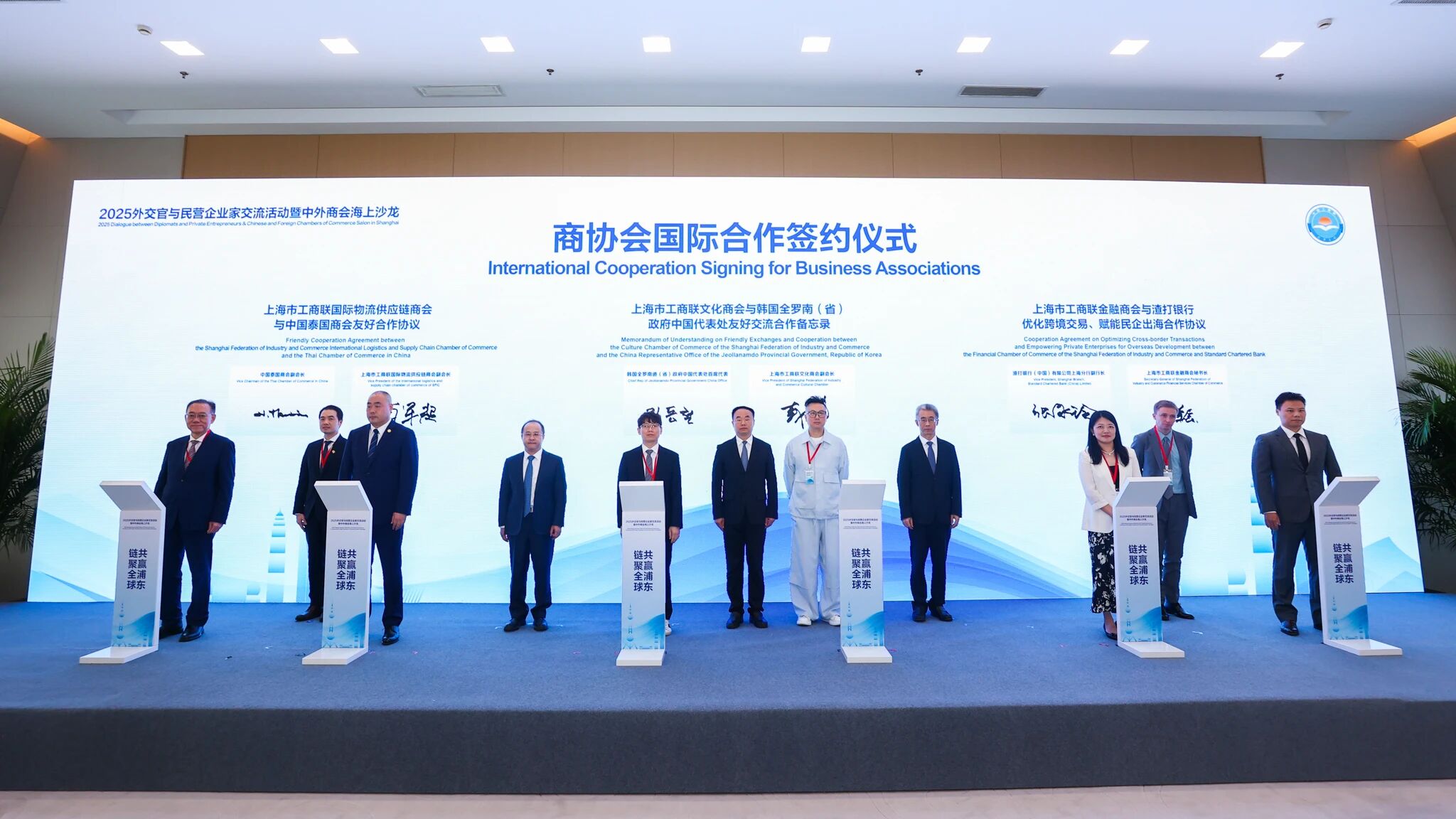 上海市工商联国际物流供应链商会、上海市工商联文化商会、上海市工商联金融服务商会分别与中国泰国商会、韩国全罗南道(省)政府中国代表处、渣打银行等签署合作备忘录,共同助力企业在全球市场中携手前行、合作共赢。
