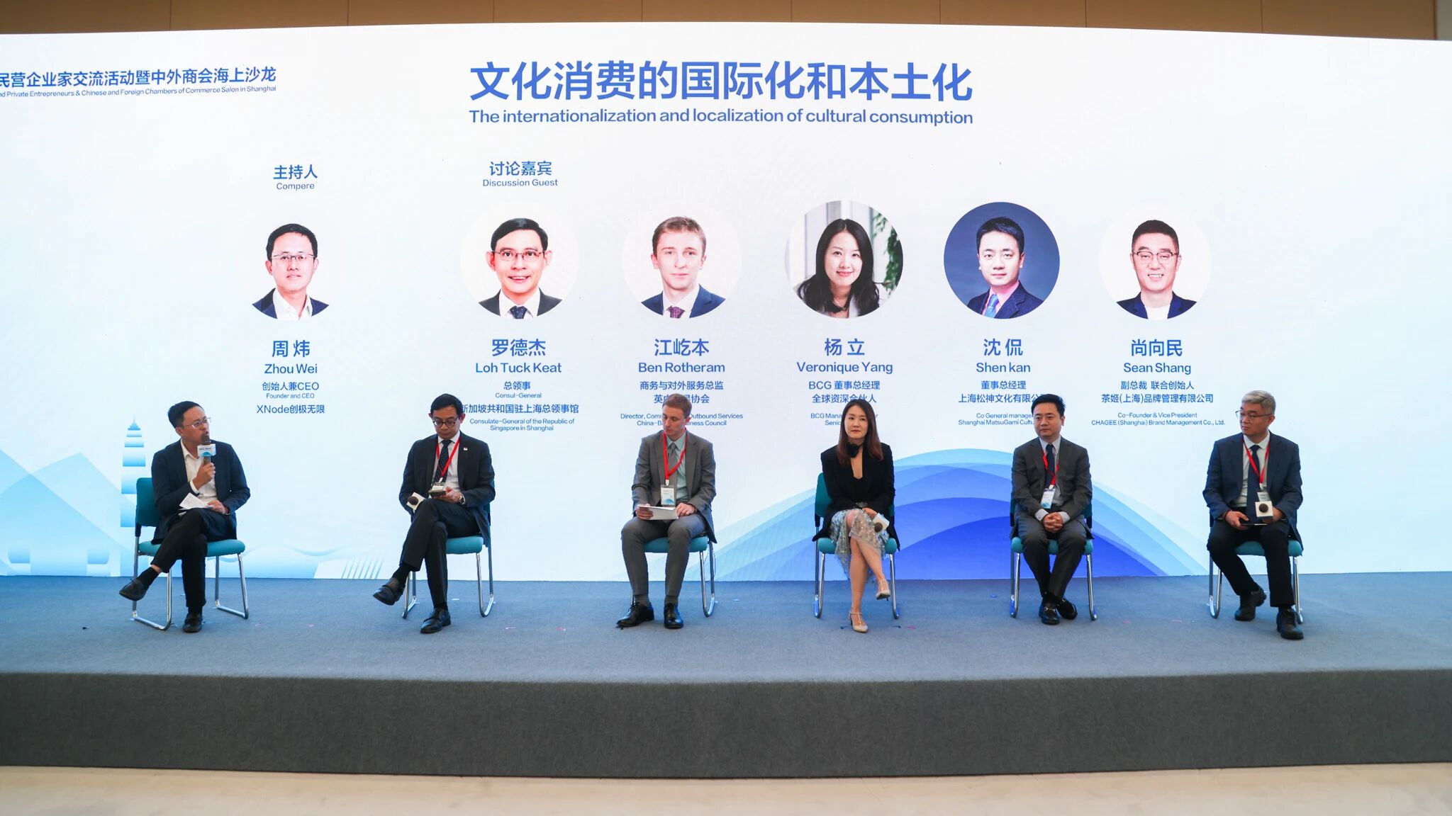 “中外商会海上沙龙”环节,新加坡驻上海总领事罗德杰,英中贸易协会商务与对外服务总监江屹本,波士顿咨询公司董事总经理杨立,上海松神文化有限公司董事长沈侃,茶姬(上海)品牌管理有限公司副总裁、联合创始人尚向民等嘉宾,围绕“文化消费的全球化与本土化”展开深入讨论,共话以商业模式创新与产业链整合,将文化资源转化为兼具全球共识与地域情感认同的消费符号的实践路径与发展方向。圆桌沙龙由XNode创极无限创始人兼CEO周炜主持。