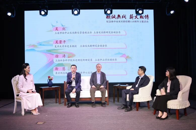 活动现场特邀吴剑,复旦大学历史系教授、上海宋庆龄研究会副会长吴景平,上海社会科学院历史研究所研究员、上海中山学社副社长徐涛,东方网总编辑助理、媒体中心主任靳慧接受访谈。大家围绕孙宋文化文博工作者的使命与担当,孙中山宋庆龄与上海,孙中山宋庆龄与中国式现代化,新时代讲好伟人故事等方面,谈了各自的认识和体会,进一步阐释了两位伟人为振兴中华而不懈奋斗的历史贡献,以及新时代秉承弘扬孙宋思想精神的意义。