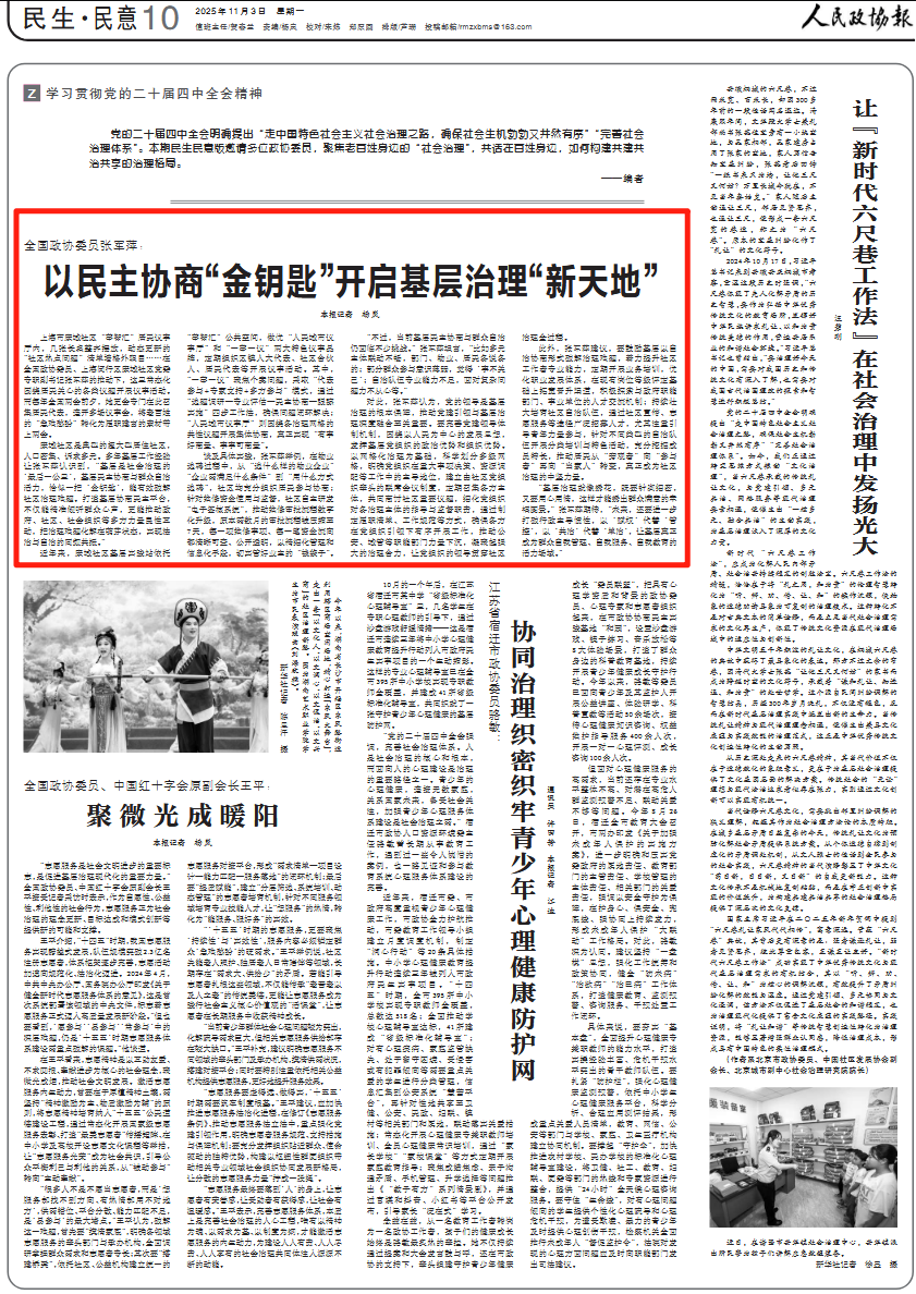 党的二十届四中全会明确提出“走中国特色社会主义社会治理之路,确保社会生机勃勃又井然有序”“完善社会治理体系”。本期民生民意版邀请多位政协委员,聚焦老百姓身边的“社会治理”,共话在百姓身边,如何构建共建共治共享的治理格局。——编者
