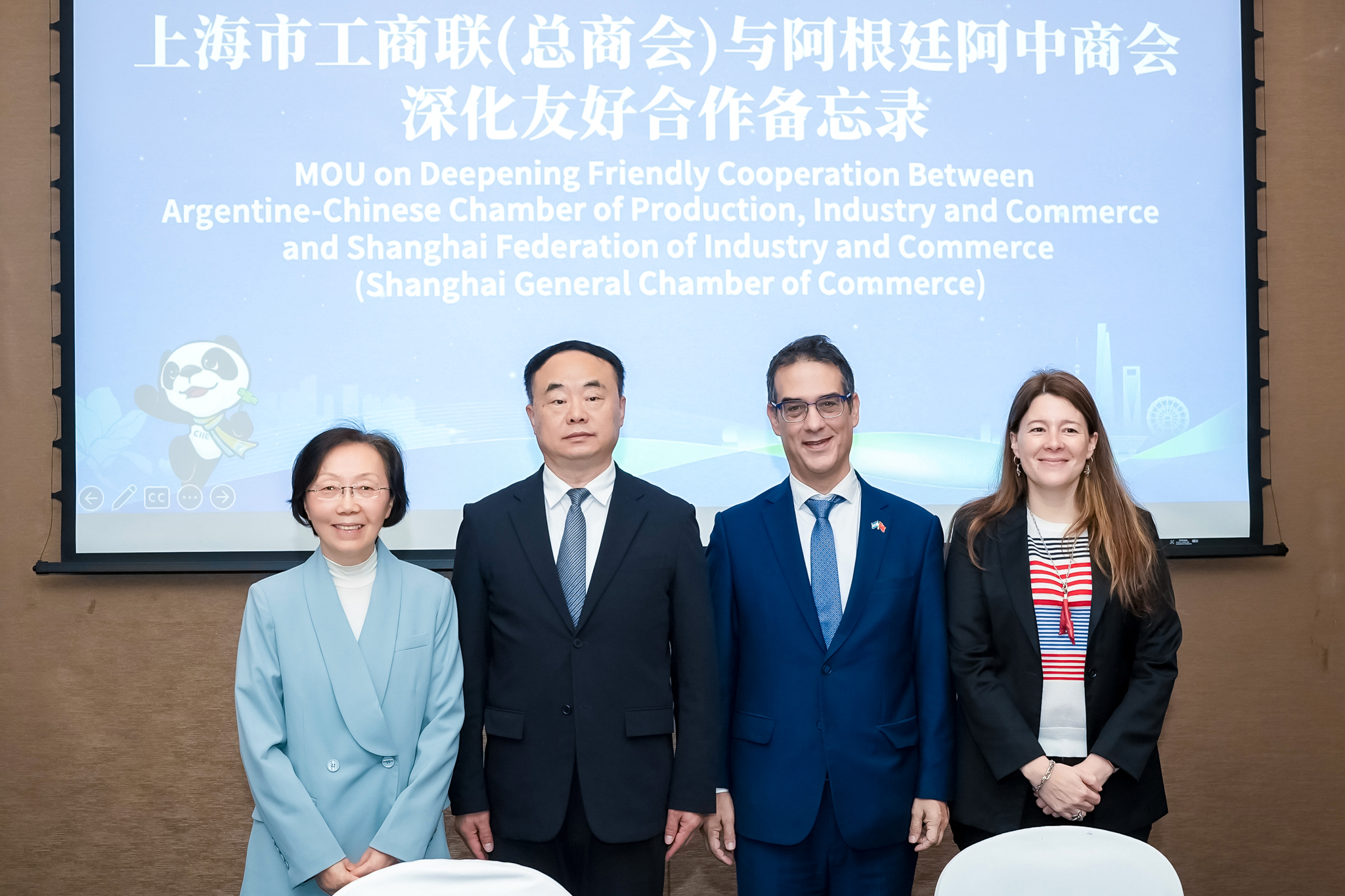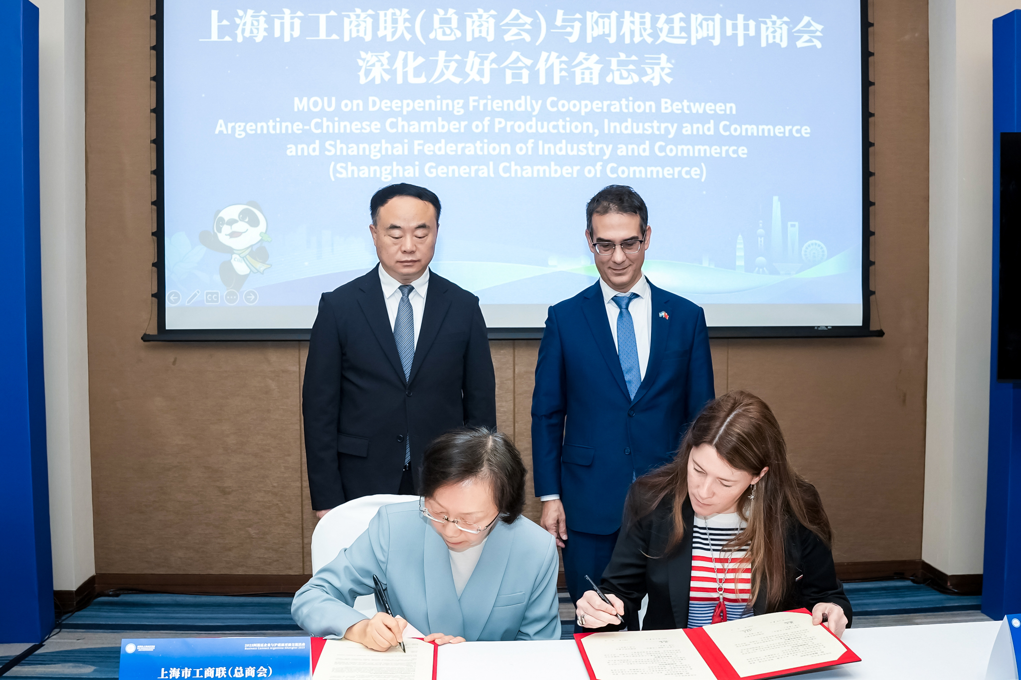 上海市工商联(总商会)副主席(副会长)杨茜与阿根廷阿中商会执行董事孔爱莉签署双方商会深化友好合作备忘录。