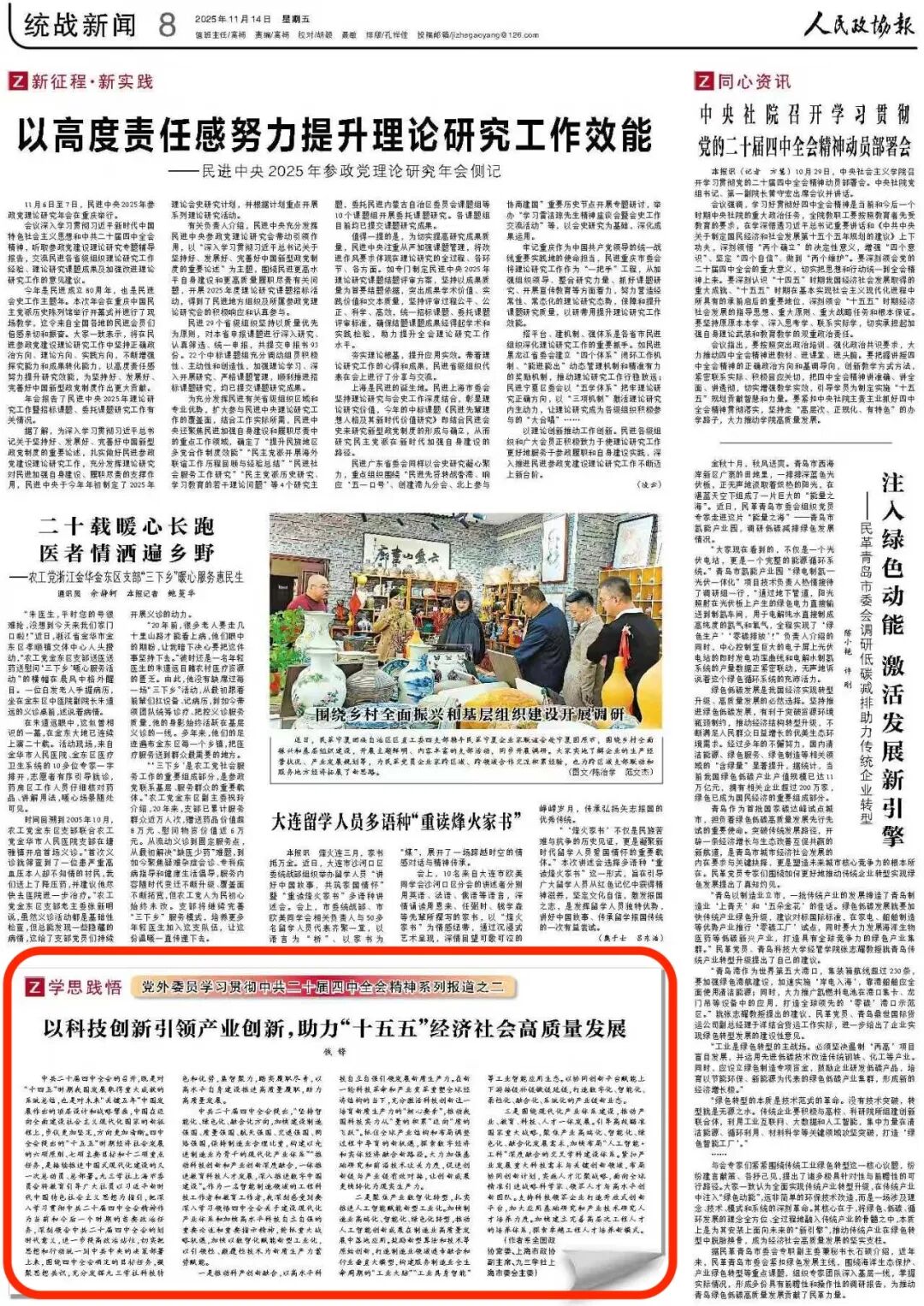 近日,全国政协常委、上海市政协副主席、九三学社上海市委主委钱锋在《人民政协报》发表署名文章《以科技创新引领产业创新,助力“十五五”经济社会高质量发展》。