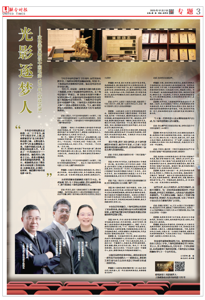 今年是中国电影走过的第一百二十个年头,两个甲子的岁月里,上海,这座曾被誉为“东方好莱坞”的电影之城,无数电影人用才华与生命点燃银幕之光。自新中国成立以来,这群优秀的电影人里,又多出了一个共同的名字——政协委员,他们用自己的赤子之心,孜孜不倦地追求着光影编织的梦想。近日,政协联线走访了数位来自不同电影工作岗位的市、区政协委员,让我们一起听听,他们眼中的中国电影120年。
