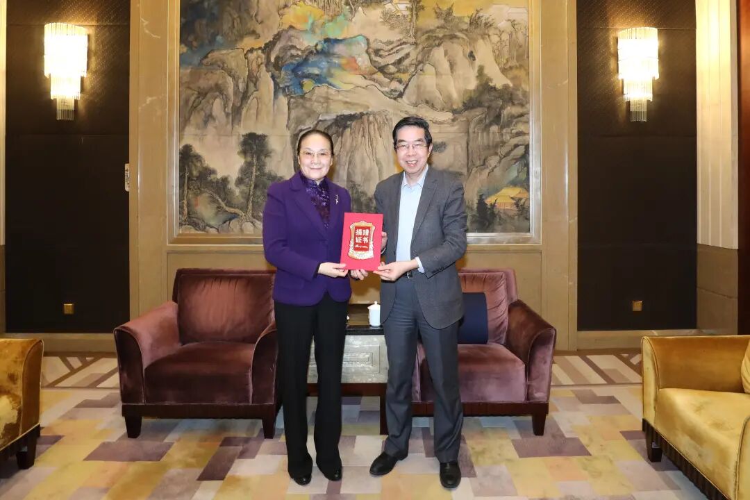 1月14日,民进上海市委会主委黄震代表民进上海市委向赵雯女士颁发捐赠证书,对赵雯女士大力支持民进工作表示衷心感谢,同时也强调了这份遗墨对于弘扬尊师重教精神的重要意义。民进上海市委专职副主委杨蓉参加。