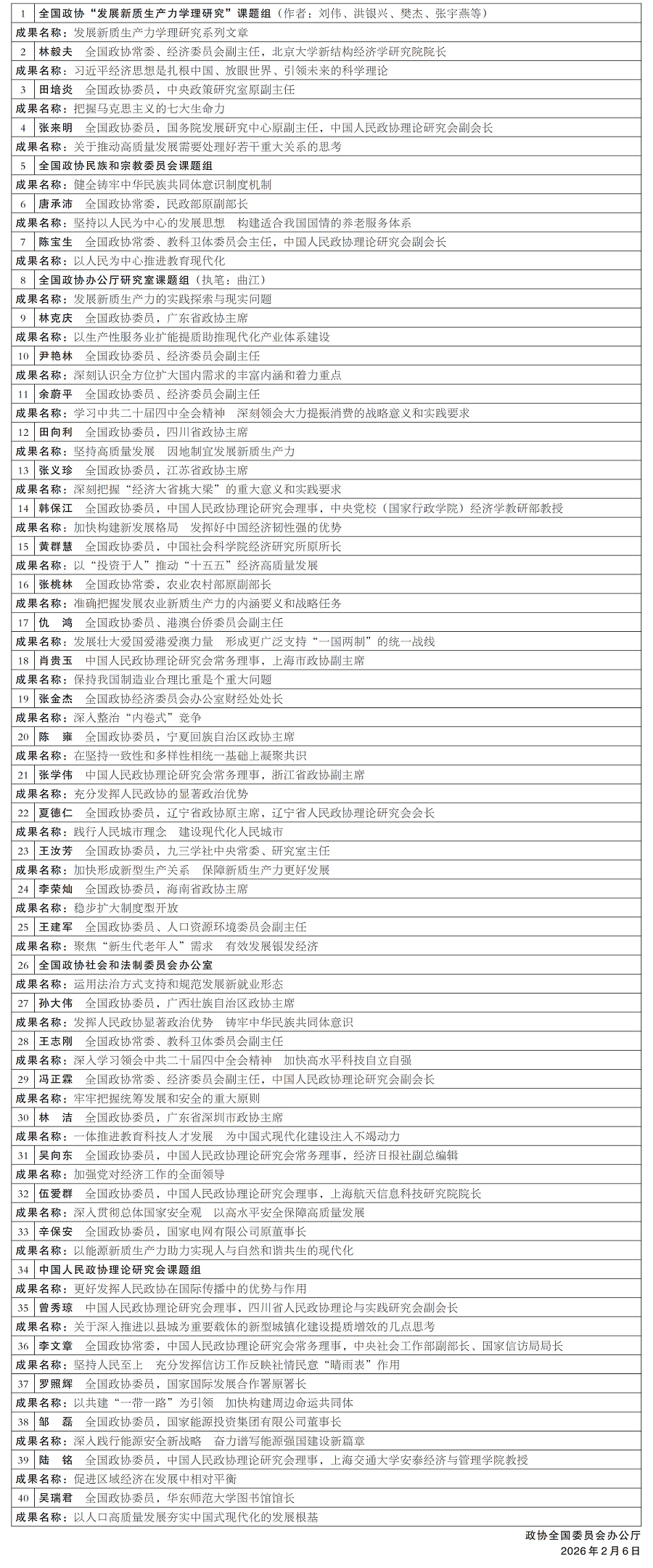 2025年,全国政协办公厅坚持以习近平新时代中国特色社会主义思想为指导,深刻领悟“两个确立”的决定性意义、坚决做到“两个维护”,常态化机制化推进党的创新理论研究阐释,制定实施理论研究工作计划,组织开展系列课题研究,召开办公厅季度理论研讨会,努力提高理论研究工作质量、拓展理论研究深度、加强研究成果转化应用。广大全国政协委员、中国人民政协理论研究会理事、全国政协机关干部积极承担研究任务,形成了一批较高质量的理论研究成果。为调动各方面参与理论研究工作的积极性、主动性、创造性,营造学理论、钻理论、用理论的良好氛围,夯实团结奋斗的共同思想政治基础,全国政协办公厅根据《政协全国委员会关于加强和改进理论研究工作的意见(试行)》等有关规定,经认真研究,决定对在2025年度理论研究工作中表现突出的个人和课题承担单位进行通报表扬。名单如下: