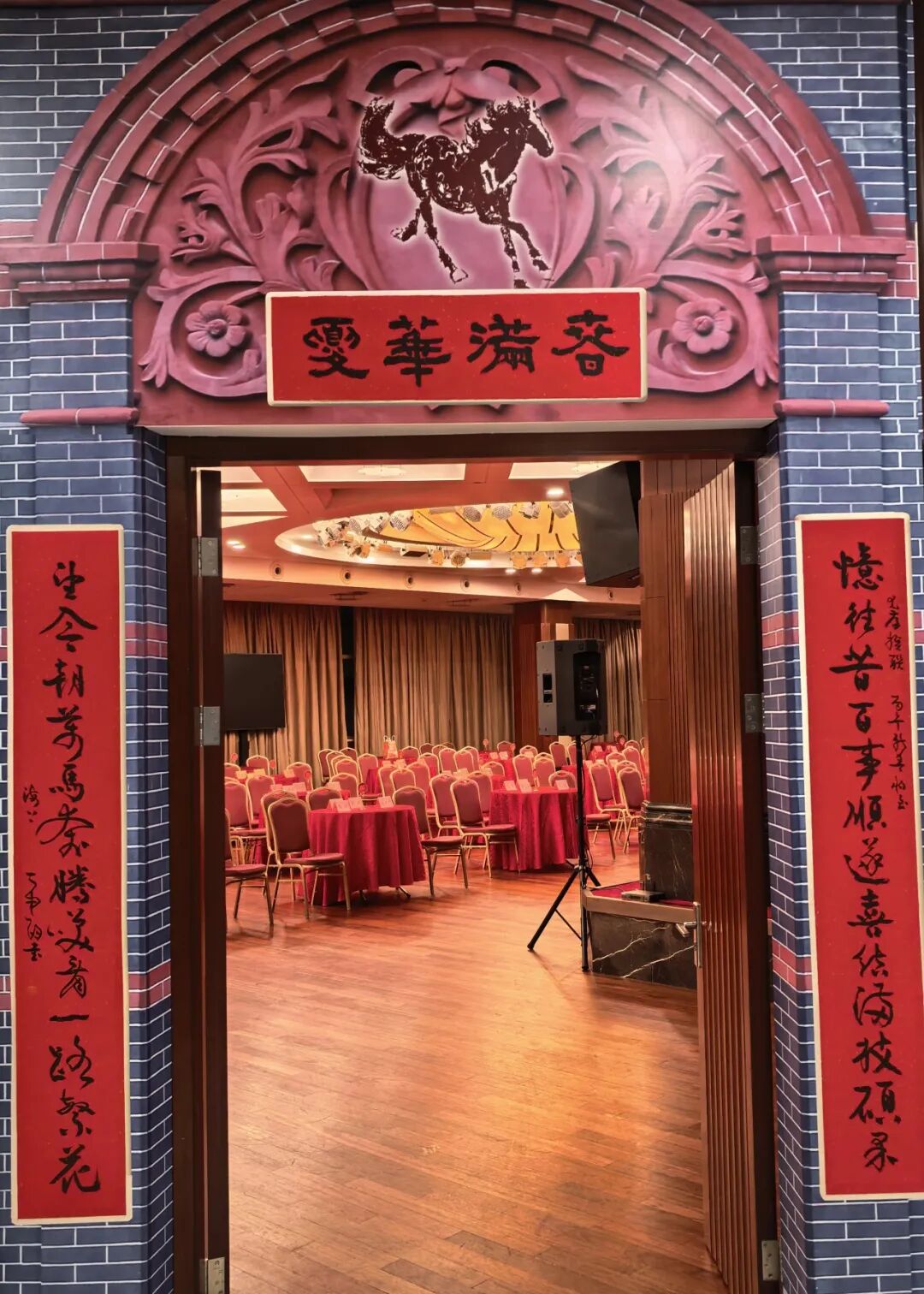 市政协江海厅布置得焕然一新,门楣上设计了海派石库门的造型,上海市书法家协会丁申阳主席特别书写横幅为“春满华夏”的对联,“忆往昔百事顺遂喜结满枝硕果,望今朝万马奔腾笑看一路繁花”,春节元素融合海派风情建筑,营造出穿越时空的时代文化韵味。