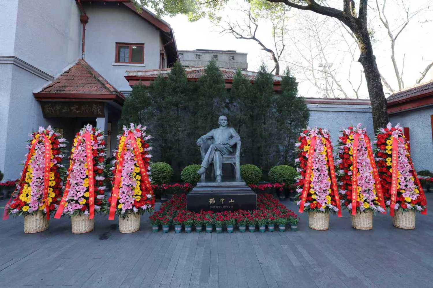 孙中山故居庭院中央,摆放着上海市政府、市政协、中共上海市委统战部、民革上海市委和中国福利会等敬献的花篮。市领导朱忠明、陈靖、徐毅松、解冬、肖贵玉和各界代表在孙中山先生铜像前肃立并三鞠躬,深切缅怀革命先辈的不朽业绩。