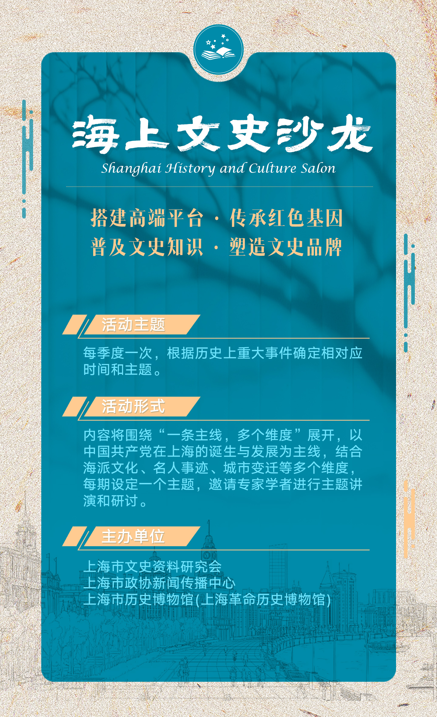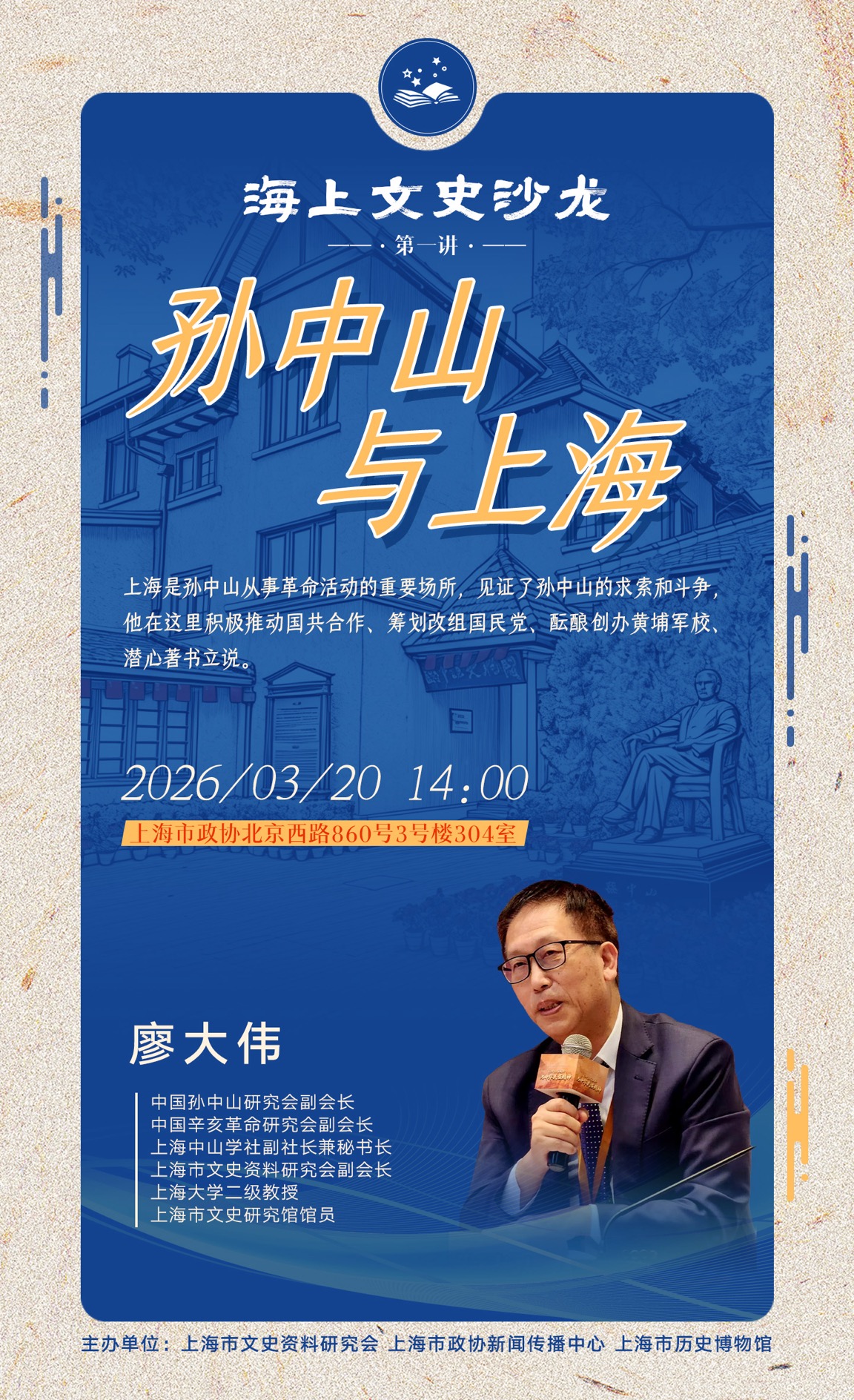 据悉,“海上文史沙龙”通过邀请文史专家讲述上海文史故事,传承城市记忆、弘扬城市精神,增强文化认同感与自豪感,助力上海建设国际文化大都市。“海上文史沙龙”将每季度结合重大历史事件节点开展,首次活动以“孙中山与上海”为主题,纪念伟大的民族英雄、伟大的爱国主义者、中国民主革命的伟大先驱孙中山先生诞辰160周年。