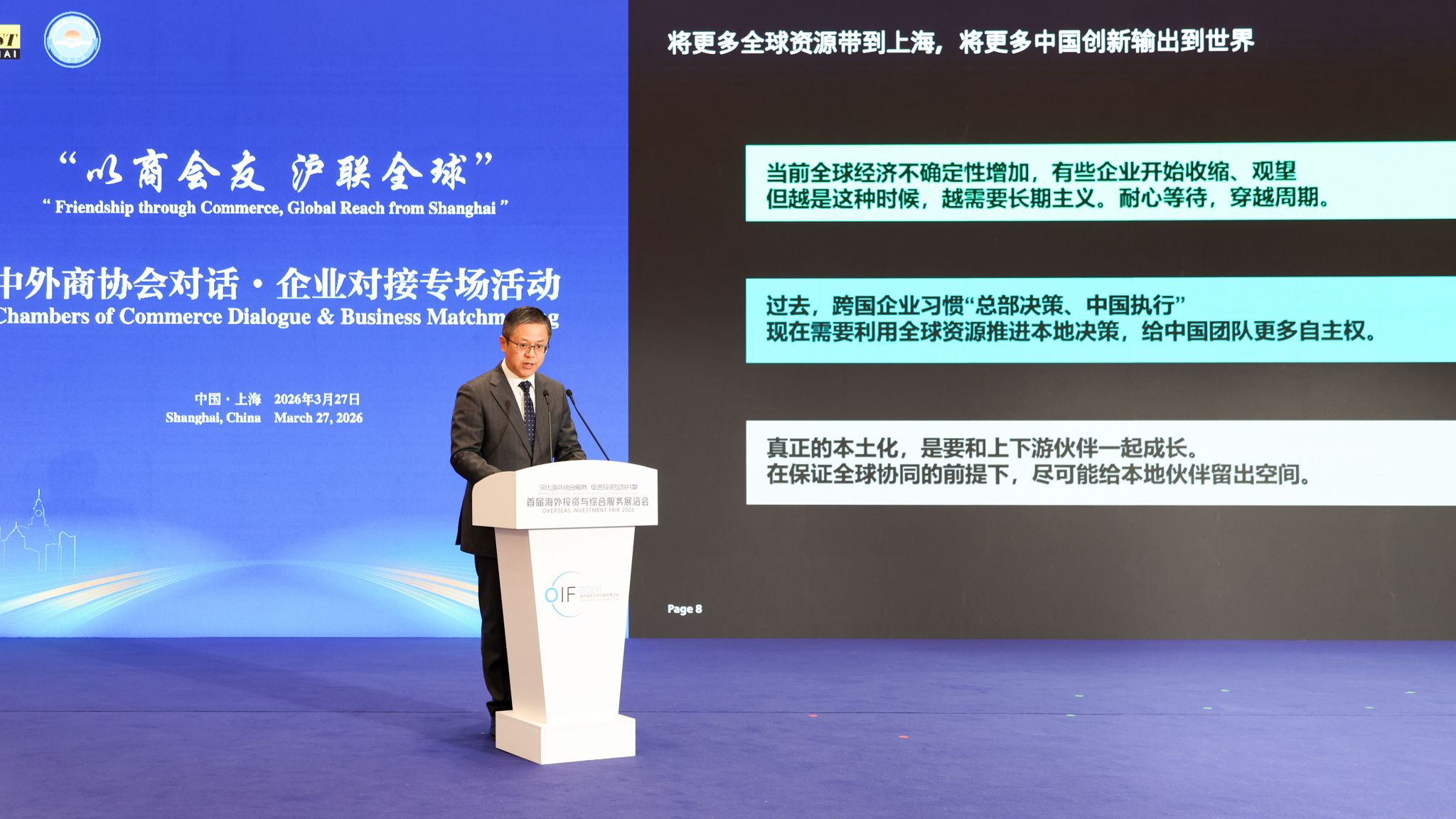 3月27日,由上海市商务委员会、上海市工商业联合会共同指导的“以商会友・沪联全球”中外商协会对话和企业对接专场,在上海东方枢纽国际商务合作区举办。本次活动作为首届海外投资与综合服务展洽会的重要组成部分,充分发挥政企沟通、中外联动的桥梁纽带作用,以双向对话机制精准对接企业“走出去、引进来”全链条需求,为中外商协会、企业、产业园区搭建共话合作、共谋发展的务实平台,吸引来自全球16个国家和地区的30余家海内外商协会、百余家企业及300余名各界代表与会,助力上海高水平对外开放。